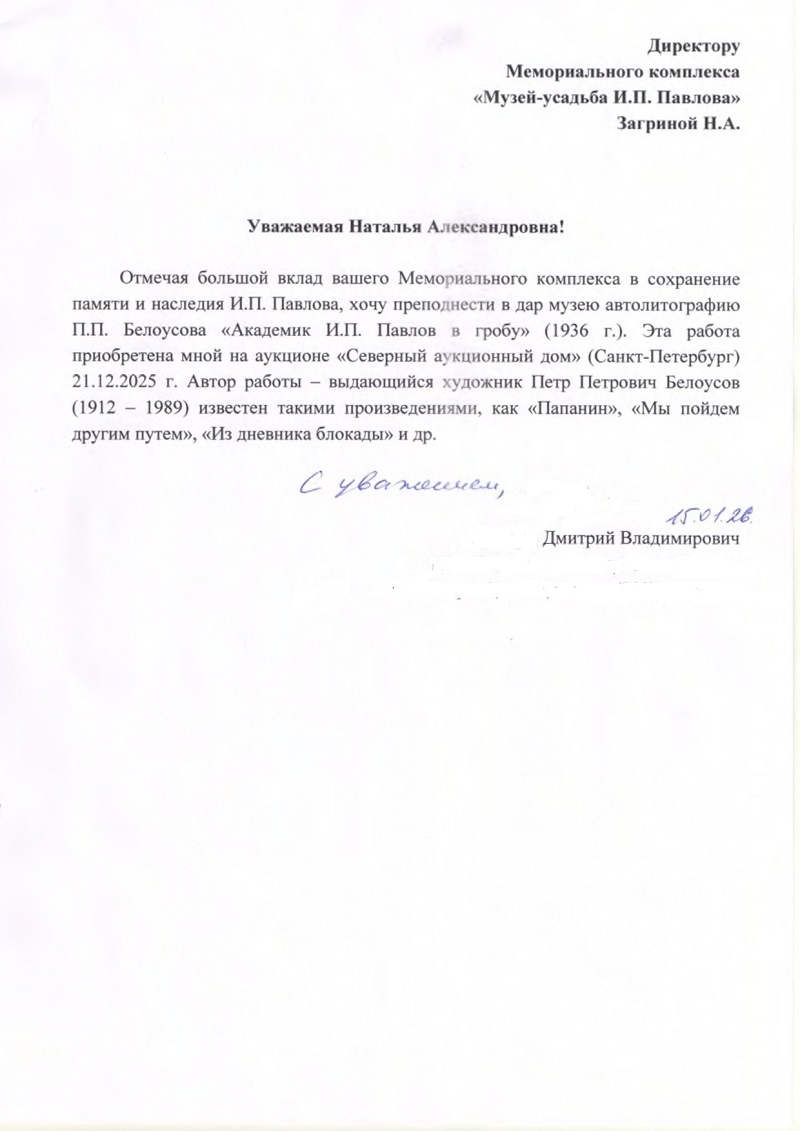 4 апреля 2026  Рады сообщить, что фонды музея-усадьбы И.П. Павлова пополнились новым значимым экспонатом: в дар был передан портрет Ивана Петровича Павлова — автолитография работы Петра Петровича Белоусова (1936). Этот подарок, особенно важный для нас в год 80-летия музея, бесценен как с художественной, так и с исторической точки зрения. Он обязательно займет достойное место в экспозиции и будет доступен для осмотра.
